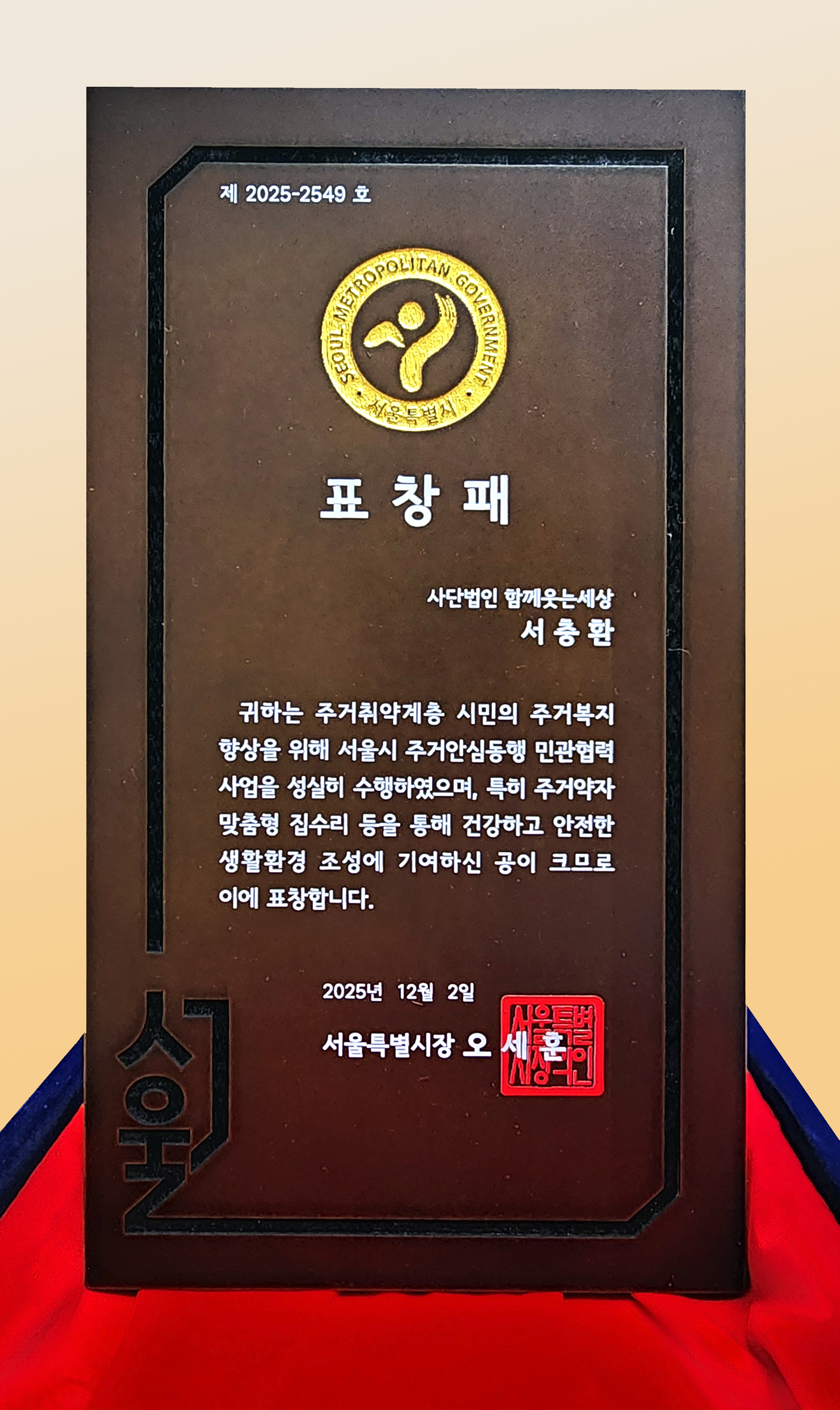 2025년 12월 2일, 주거안심동행 민관협력사업 동행파트너의 노고를 기리는 자리에서 함께웃는 세상은 서울시장 표창 수상 하였습니다.