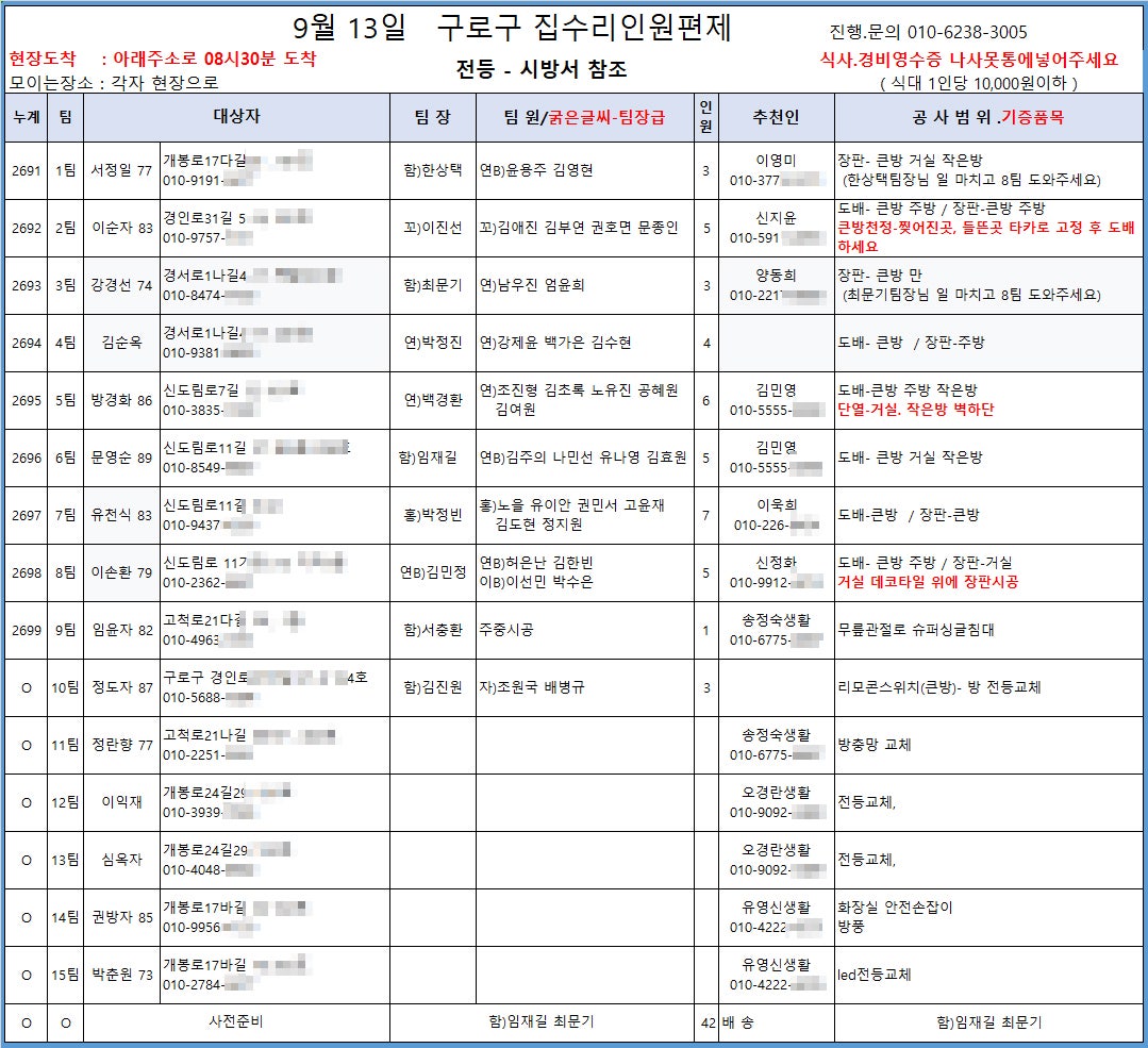 이날 구로구의 15가구(집수리 9가구 + 단순수리 6가구)를 위해 꼬꼬봉, 연세대OB, 연세대, 홍익대, 이화여대OB 학생들과 개인 자원봉사자, 함께웃는세상 봉사팀장 등 42명의 마음이 한자리에 모였습니다.