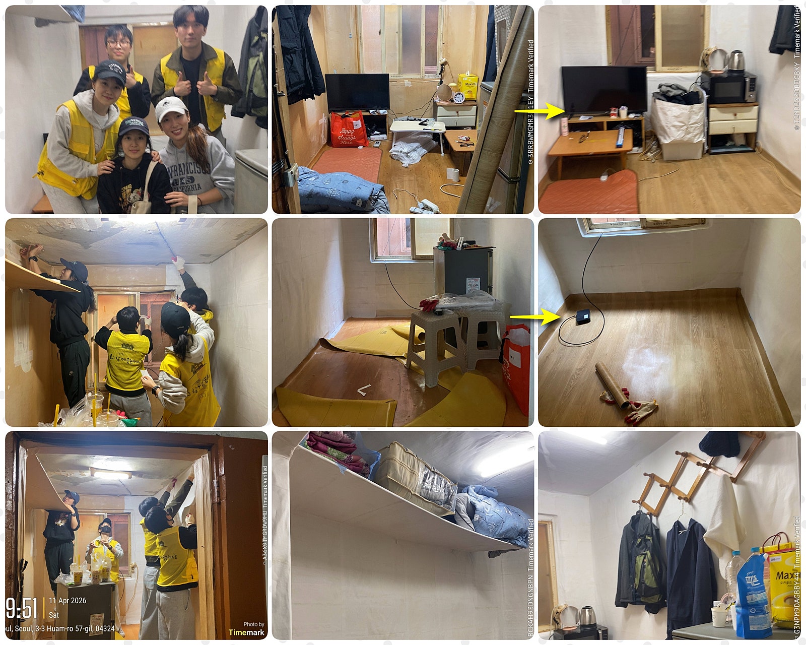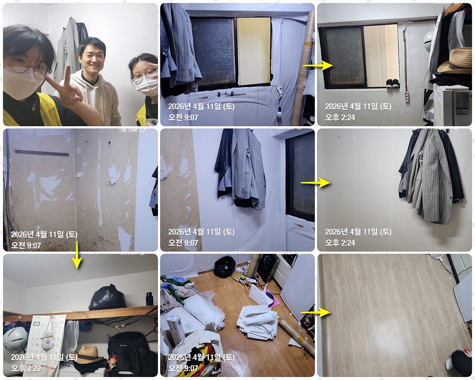 이번주는 먼저 폐기물과 묵은 짐을 버리고 청소를 하는 작업을 하고 다음주에 싱크대를 교체하고, 짐정리용 선반과 행거를 제공하여 짐을 정리해드리고 침대를 제공하고 도배와 장판 등의 집수리를 진행할 예정입니다.
