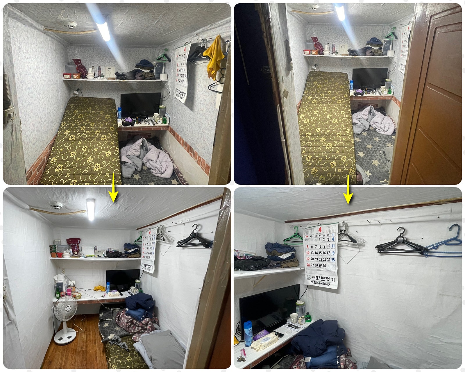 다만, 천장은 도배가 되어 있지 않은 나무 합판이 그대로 드러나 있어 주거환경 개선이 필요한 상태였습니다.