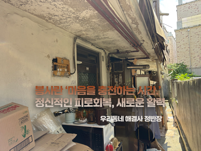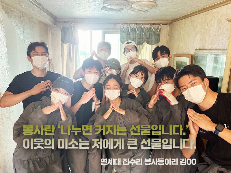 집수리 봉사에 참여하면서, 이마에 땀을 흘리고 옷에 묻은 흔적이 굳어진 옷을 세탁하고, 저장강박증 가구의 오물묻은 폐기물을 치우는 경험을 통해 봉사에 대한 나의 개념이 크게 변했습니다.