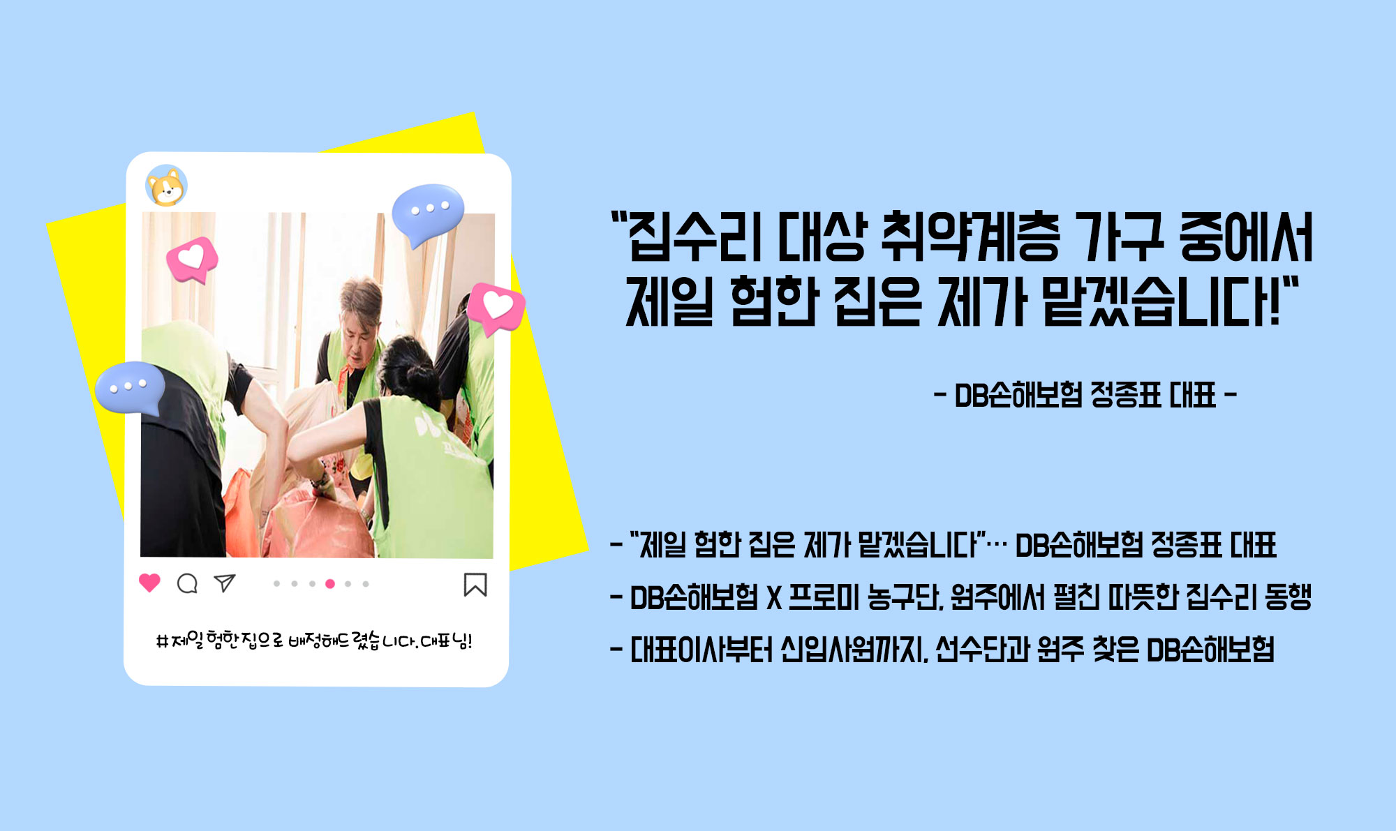 이날 봉사단은 원주 시내의 홀몸 어르신과 국가유공자 분들의 댁을 찾아 낡은 도배지와 장판을 교체하고, 생활개선 물품을 지원하며 구슬땀을 흘렸습니다. 가장 험한 곳을 마다하지 않은 대표이사부터 코트 밖에서도 팀워크를 발휘한 선수단까지, DB손해보험의 따뜻한 동행은 지역 사회에 훈훈한 온기를 전했습니다.