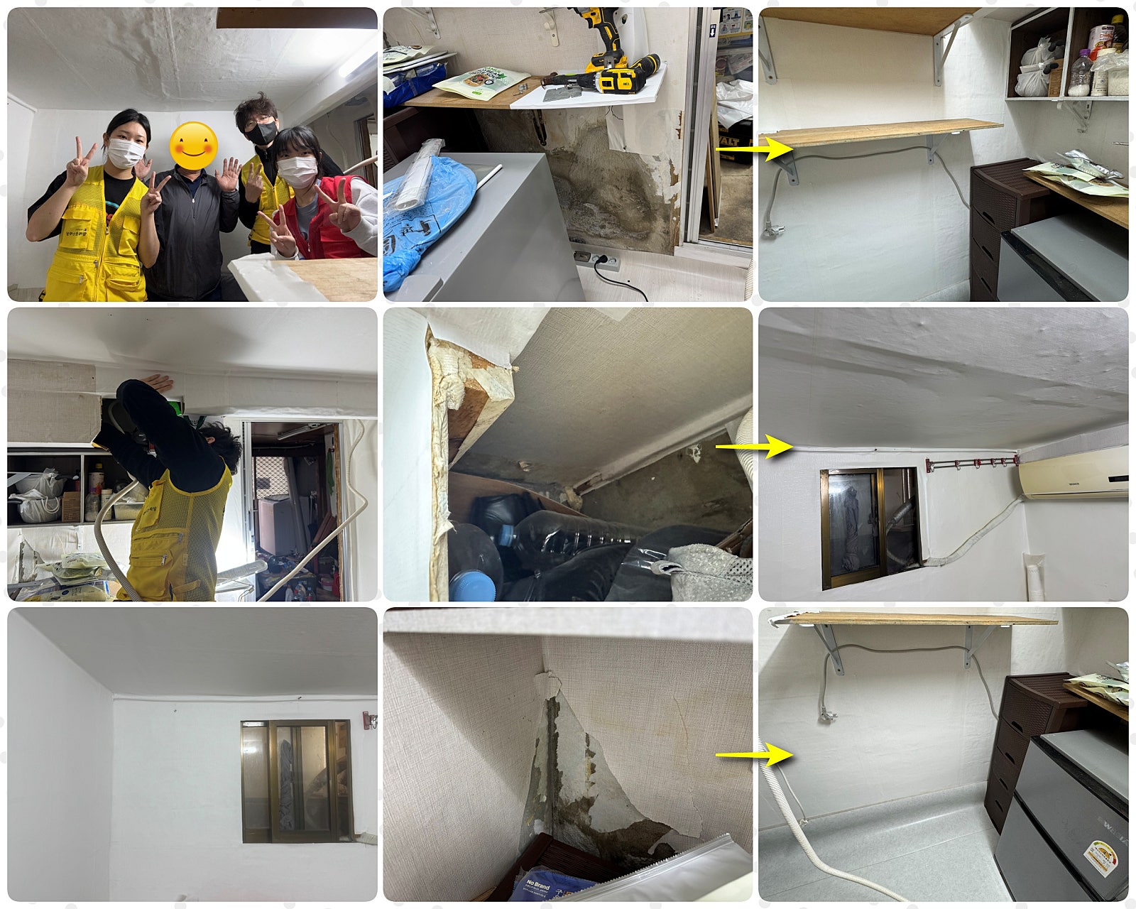 이번주는 먼저 폐기물과 묵은 짐을 버리고 청소를 하는 작업을 하고 다음주에 싱크대를 교체하고, 짐정리용 선반과 행거를 제공하여 짐을 정리해드리고 침대를 제공하고 도배와 장판 등의 집수리를 진행할 예정입니다.